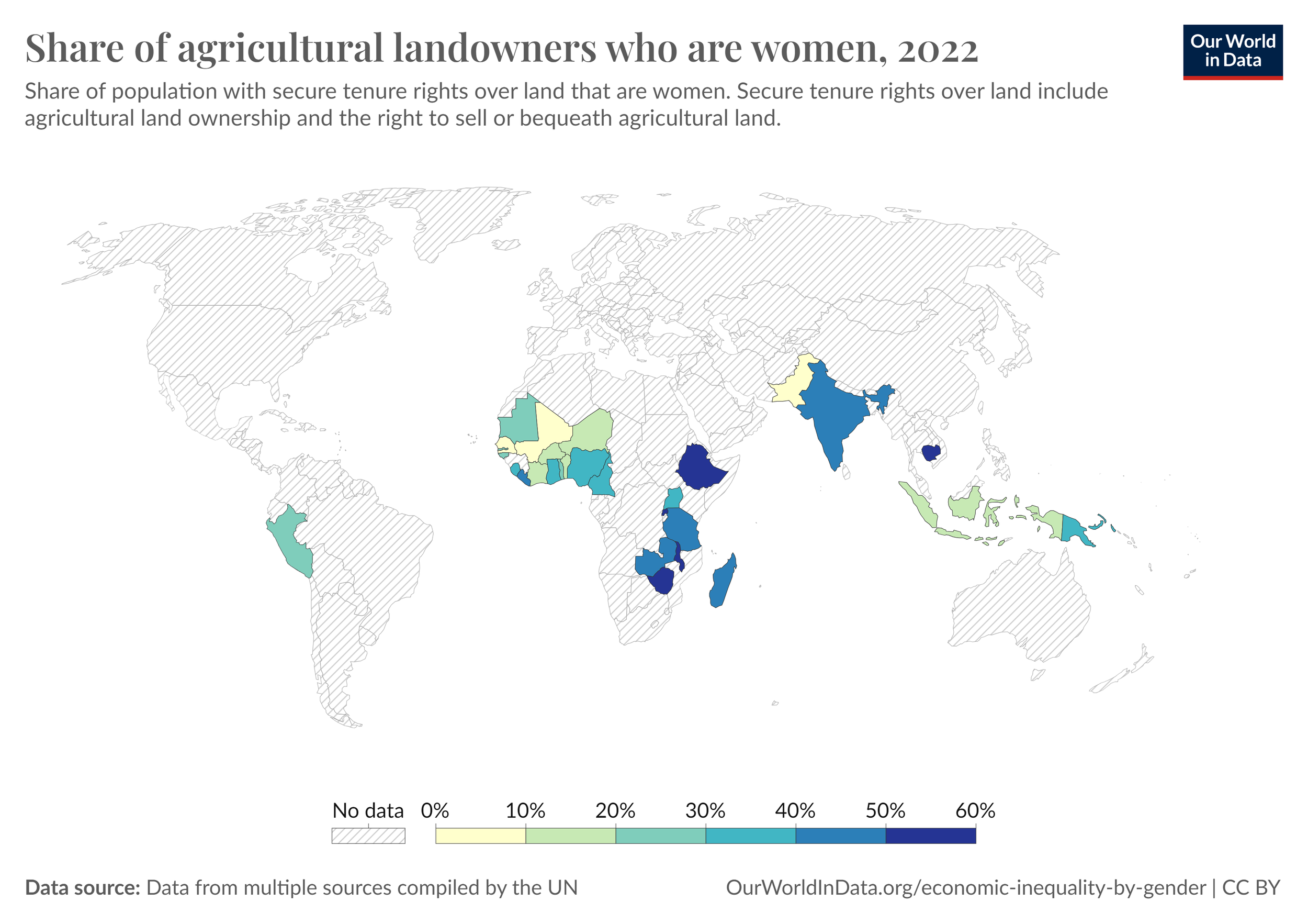 Among the countries with data as of 2022, most are developing countries. Cambodia leads with 88% of women having secure agricultural land rights and 54% of the share of agricultural landowners. Malawi has the largest share with 56%, with Pakistan the least among those with data at 6%.